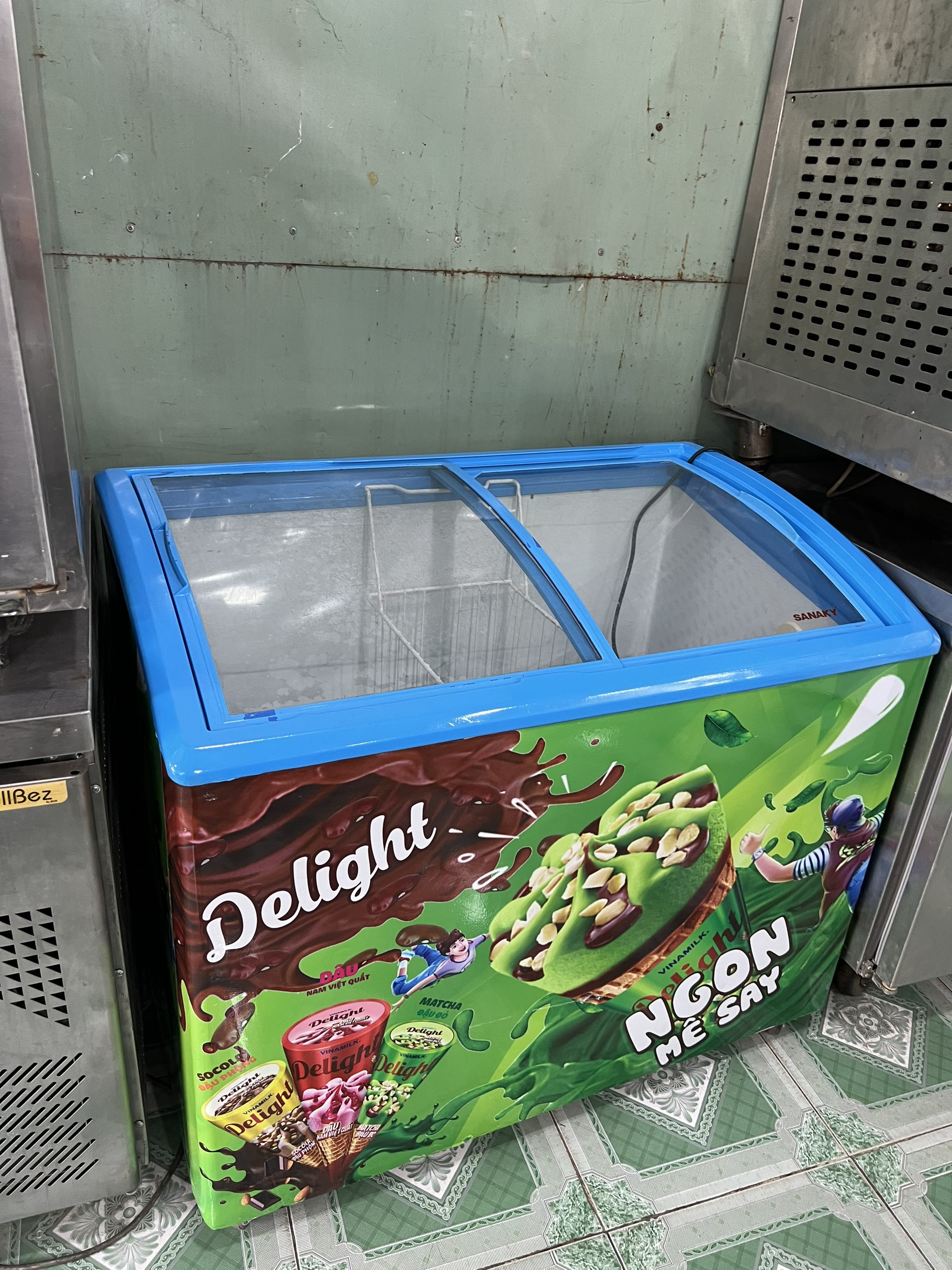 Tủ đông mặt kính cũ hiệu Sanaky 300 lít, làm lạnh tốt, mát lạnh nhanh, mặt kính tiện dụng trưng bày sản phẩm, bánh xe dưới tủ tiện di chuyển,....